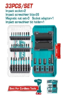 Bộ 33 đầu tuýp và mũi bắt vít đóng gồm: 2 đầu tuýp vặn vít Cr-mo: 12/14mm 18 mũi bắt vít 25mm: PH1/PH2/PH3/PZ1/PZ2/PZ3/SL4/SL 5/SL6/T10/T15/T20/T25/T30/H3/H4 /H5/H6 8 mũi bắt vít 50mm: PH2/PH3/PZ2/SL5/SL6/T20/T25/T3 0 3 đai ốc từ tính 48mm: 6,8,10mm 1 chuyển đổi 3/8" 1 khung đỡ Đóng gói bằng vỉ đôi